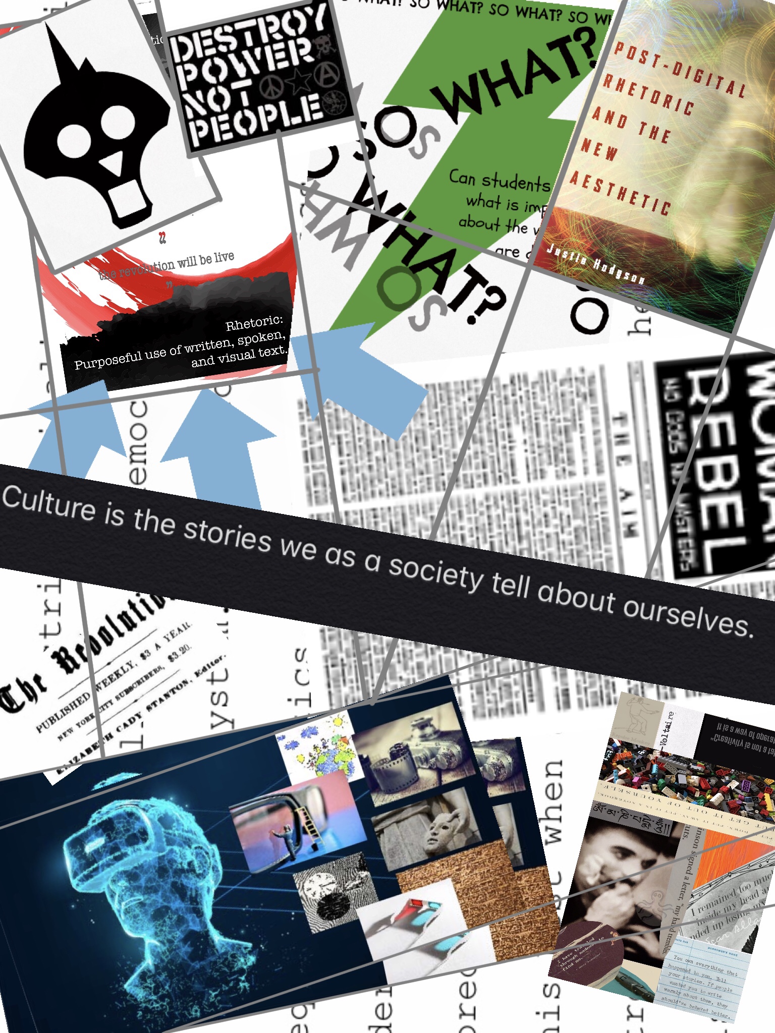 The top image is a bricolage of images from in my photos app. Most are from this class though a few are from past projects. It gives a representational reflection, a mirror if you will, of my change during and because of this class and the interactions.